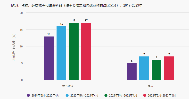 2023年,季節(jié)限定產(chǎn)品在所有蛋糕、酥皮糕點(diǎn)和甜食新品中的占比為17%。近年來(lái),季節(jié)限定細(xì)分品類中的高端產(chǎn)品的占比穩(wěn)步增長(zhǎng)。這表明,品牌可以借助季節(jié)性慶祝活動(dòng)的機(jī)會(huì),鼓勵(lì)消費(fèi)者在購(gòu)買(mǎi)蛋糕時(shí)進(jìn)行消費(fèi)升級(jí)。其中許多新品是具有新穎風(fēng)味的傳統(tǒng)慶祝蛋糕,或者采用季節(jié)限定風(fēng)味的年度熱銷產(chǎn)品。