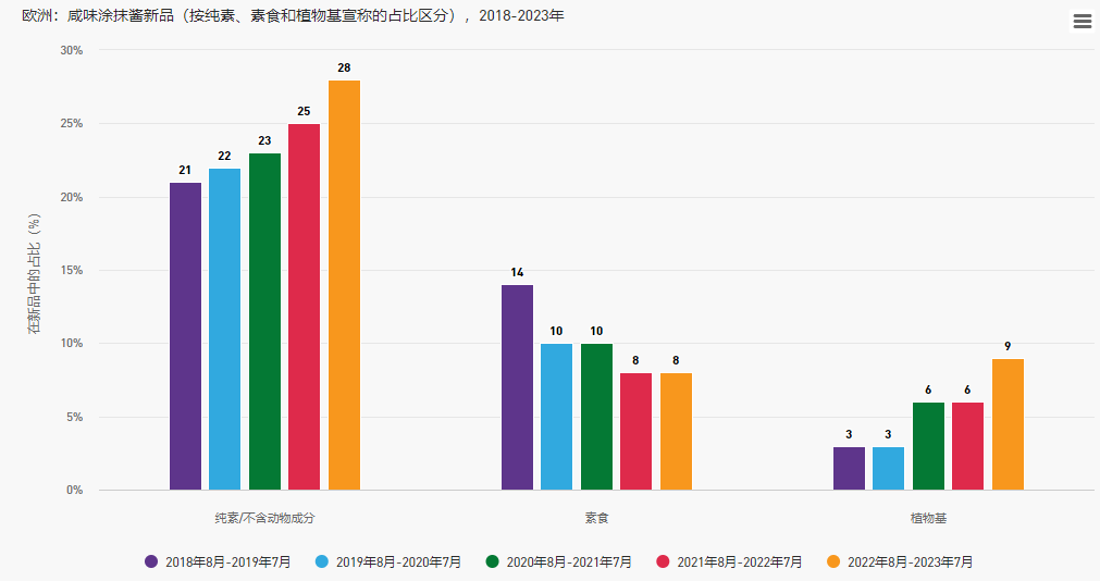 不含動(dòng)物成分的趨勢(shì)在咸味植物涂抹醬和三明治夾心子品類中尤為顯著,該品類中的植物基和純素新品在近幾年大幅增加。