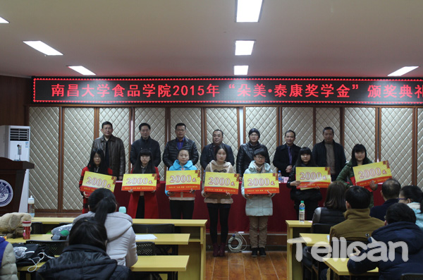 2015年12月29日上午,第二屆“朵美·泰康獎學(xué)金”頒獎典禮在南昌大學(xué)食品學(xué)院舉行。南昌朵美生物科技有限公司總經(jīng)理丁泉水、南昌泰康食品科技有限公司總經(jīng)理馬小明、南昌大學(xué)學(xué)工委辦主任游偉平、食品學(xué)院院長劉成梅、黨委書記譚杰、黨委副書記劉志鳳、副院長張國文、副院長熊濤以及全體輔導(dǎo)員出席此次典禮。典禮由劉志鳳主持。